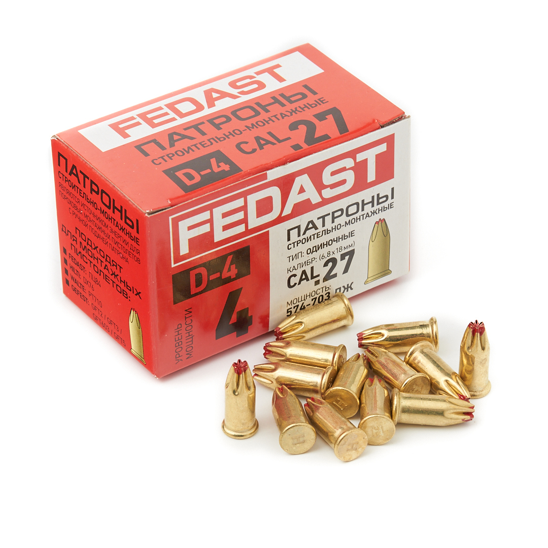 - Совместим с строительным монтажным пистолетом FEDAST PC 84 (ПЦ-84) и другими пистолетами, поддерживающими одиночные патроны калибра 6,8х18 мм.