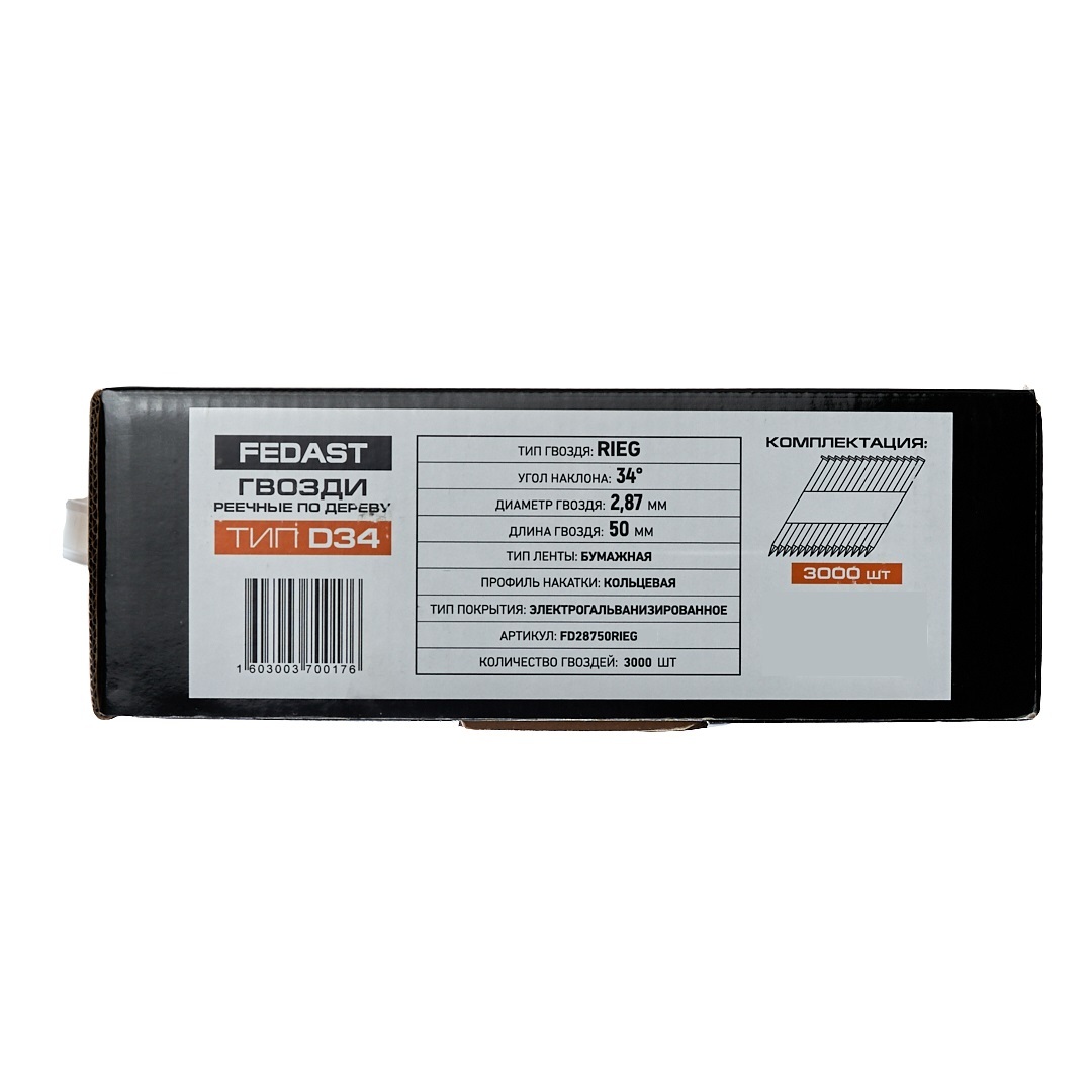 - Реечные гвозди по дереву тип D34 (2,87х50, RIEG гальв. кольц. накат., 3000 шт/уп) FEDAST
