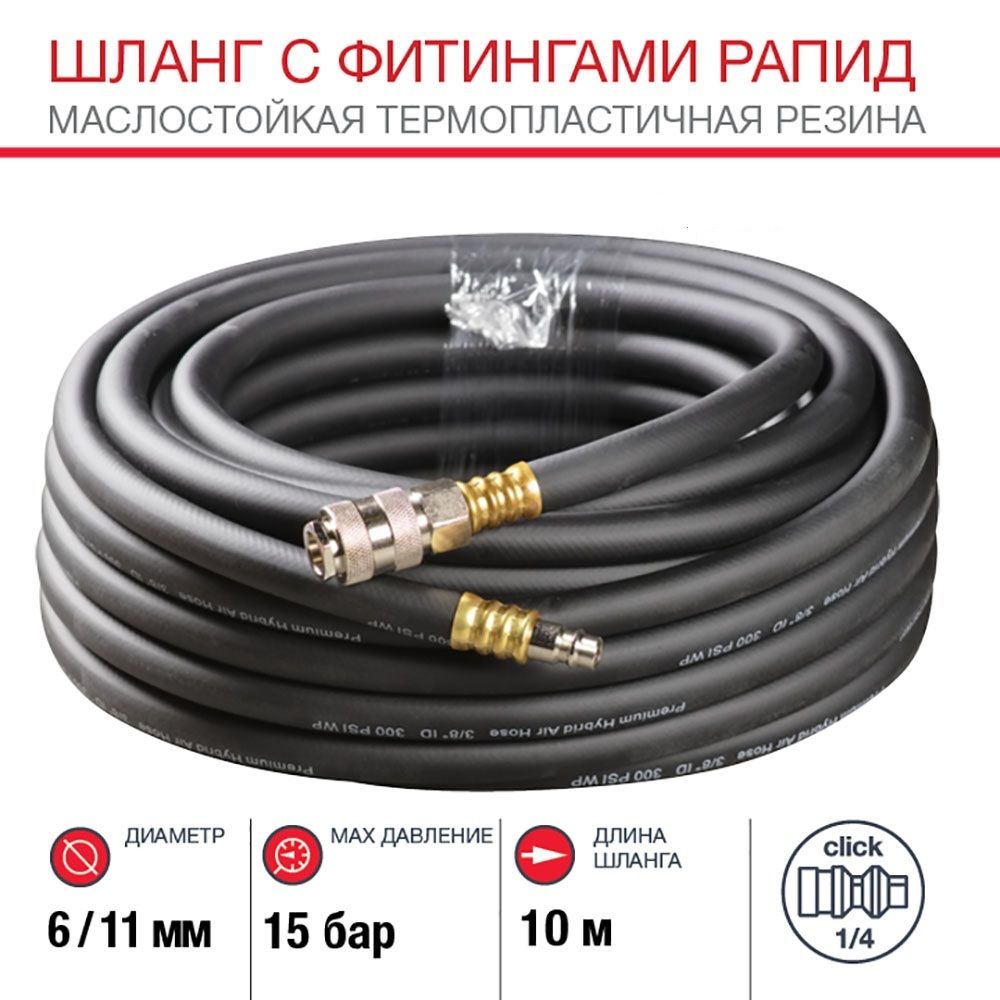 Шланг с фитингами рапид из маслостойкой полиуретановой резины (15 бар, 6x11 мм, 10 метров) — это высококачественный пневматический шланг, предназначенный для подключения пневмоинструментов к устройствам для сжатия газа. С его помощью вы сможете эффективно работать на нужном расстоянии, обеспечивая стабильную подачу сжатого воздуха.